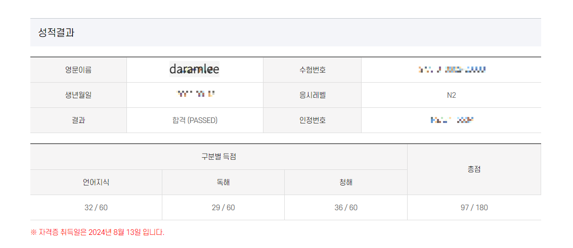 N3 거치지 않고 노베이스에서 바로 N2에 덤벼든 만큼 많이 부끄러운 점수입니다 ㅋㅋㅋ